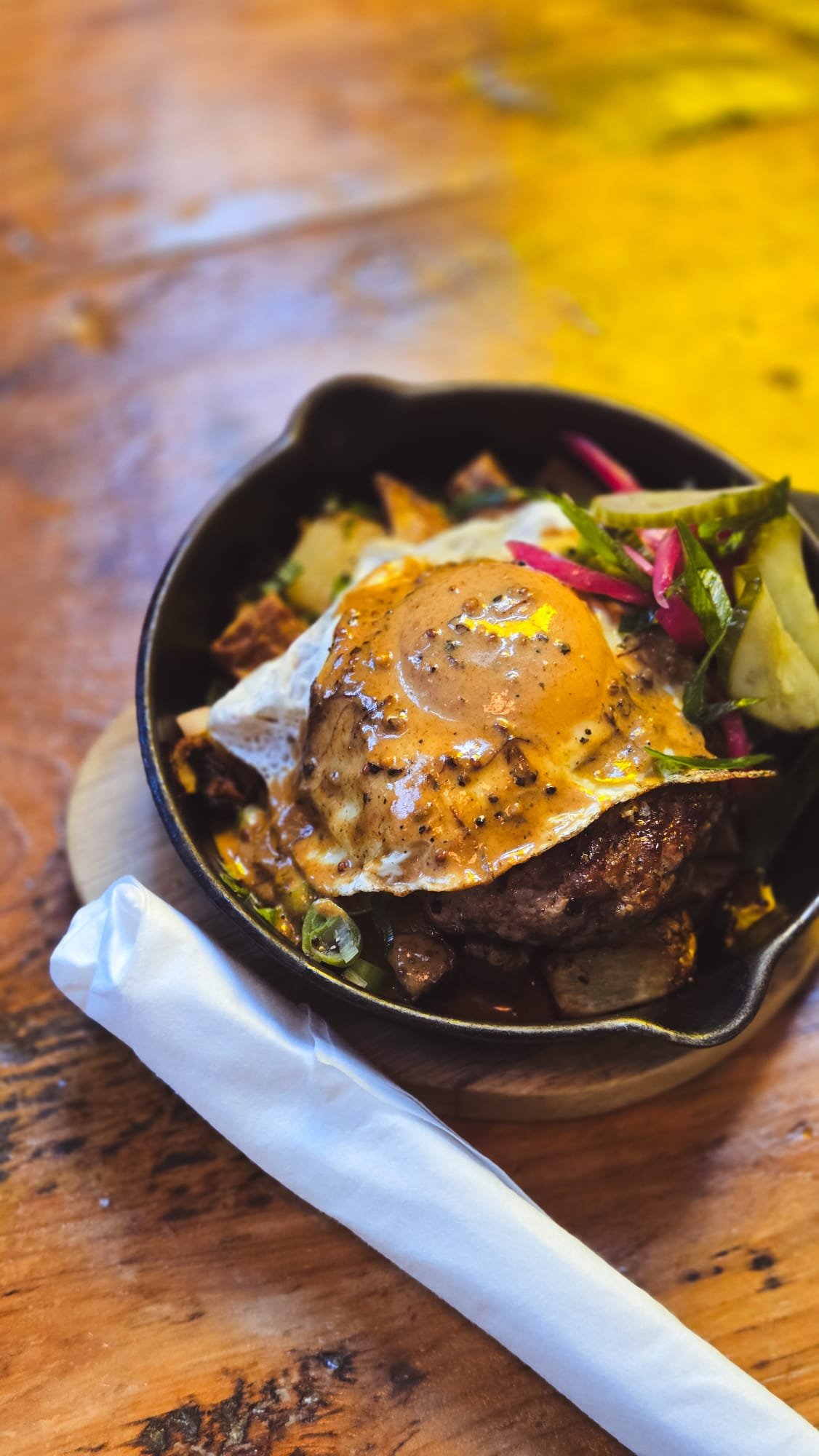 roasted tomato, fried egg, pepper corn sauce, scallions, mixed pickles
